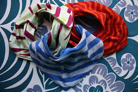 De två översta dregglisarna är sydda av Vamlingbolaget-stuvar och den randiga av loppisfyndad randig trikå. Alla tre har baksida av återbrukad fleecefilt.